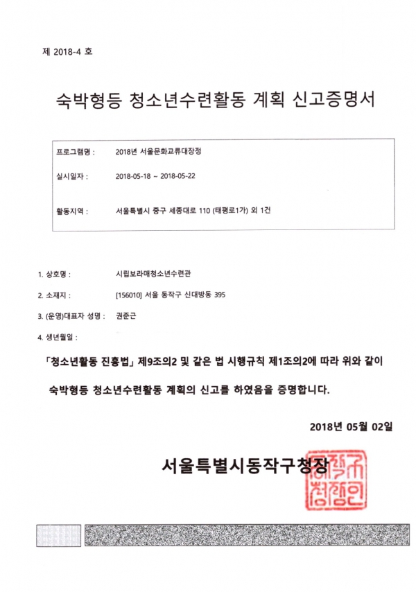 | û¼Ò³â¼ö·ÃȰµ¿½Å°í °íÁö - 2018³â ¼¿ï¹®È±³·ù´ëÀåÁ¤ | |||