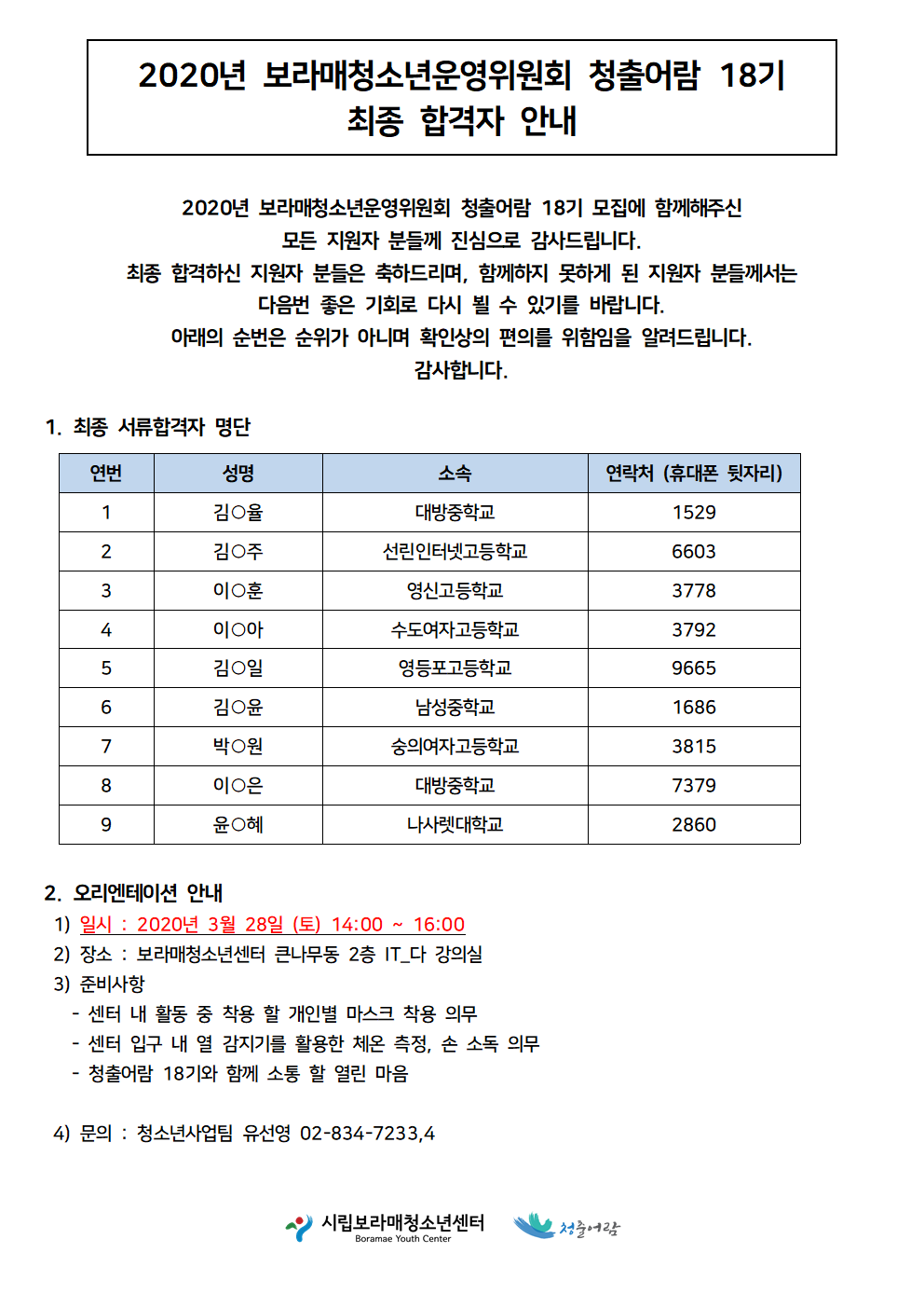 | [°øÁö] 2020³â º¸¶ó¸Åû¼Ò³â¿î¿µÀ§¿øÈ¸ ûÃâ¾î¶÷ 18±â ÃÖÁ¾ ÇÕ°ÝÀÚ ¾È³» | |||