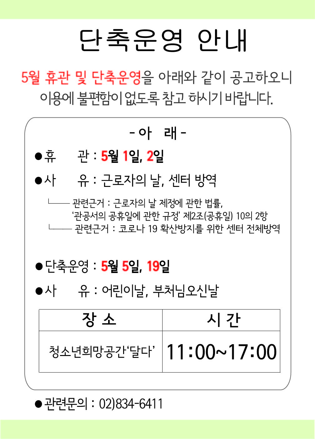 | [°øÁö] 5¿ù ÈÞ°ü ¹× ´ÜÃà¿î¿µ ¾È³» °øÁö | |||
