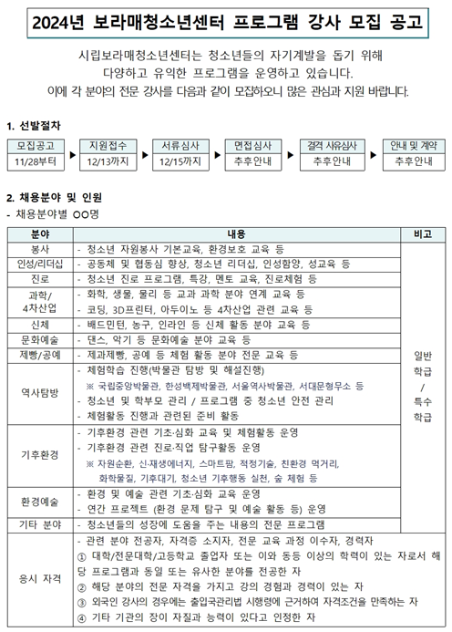 | [ä¿ë] 2024 º¸¶ó¸Åû¼Ò³â¼¾ÅÍ ÇÁ·Î±×·¥ Àü¹®°»ç ¸ðÁý °ø°í | |||