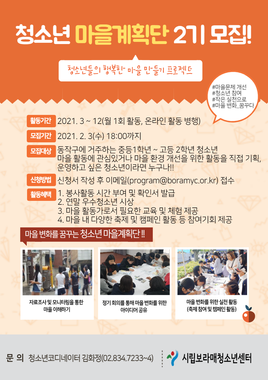| ÀÛ¼ºÀÚ : û¼Ò³â»ç¾÷ÆÀ(program@boramyc.or.kr) ÀÛ¼ºÀÏ : 2021-01-20 Á¶È¸¼ö : 3371 | |||