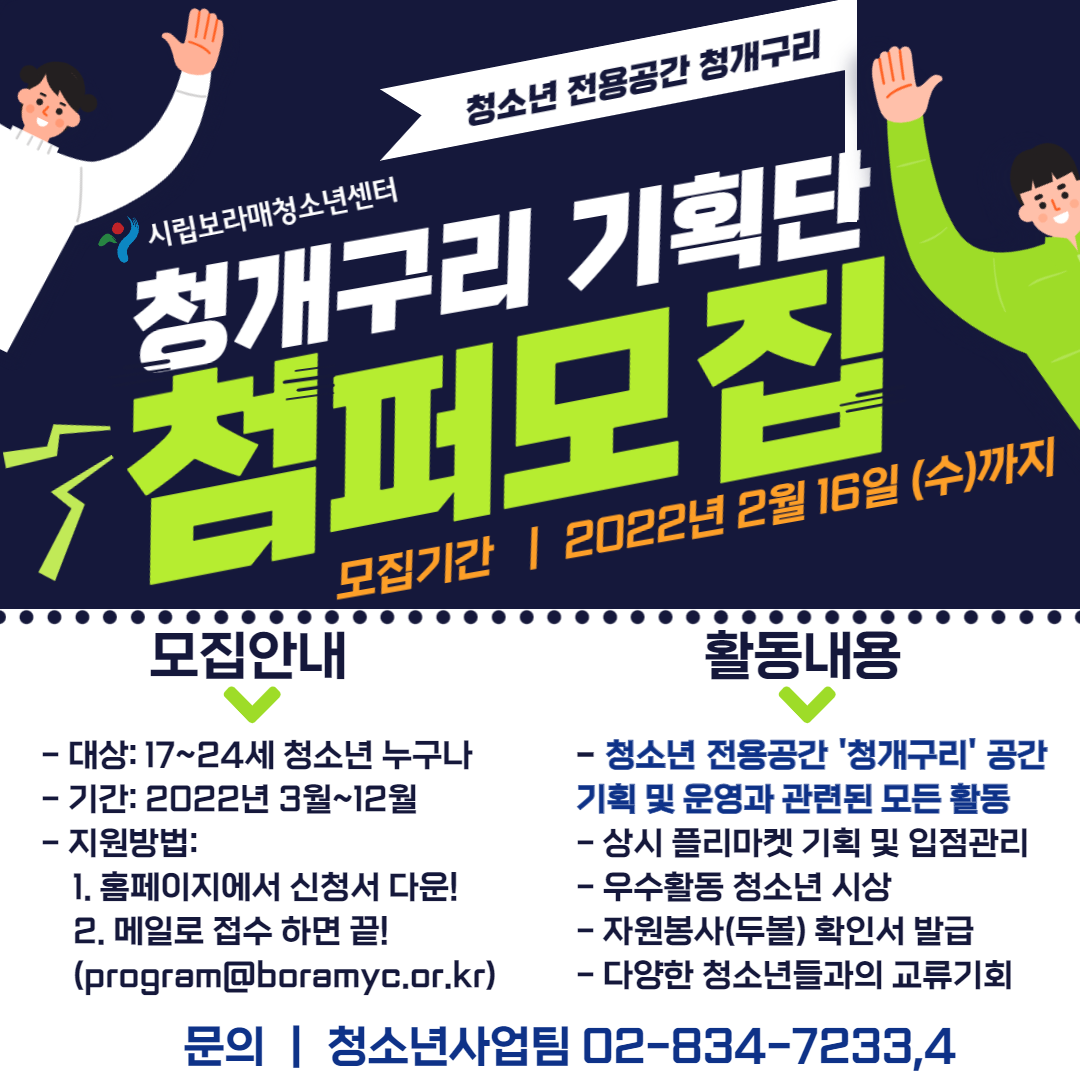 | [¸ðÁý] û¼Ò³â Àü¿ë°ø°£ û°³±¸¸® ±âȹ´Ü '÷ÆÛ' ¸ðÁý (±â°£ ¿¬Àå ~2/16±îÁö) | |||