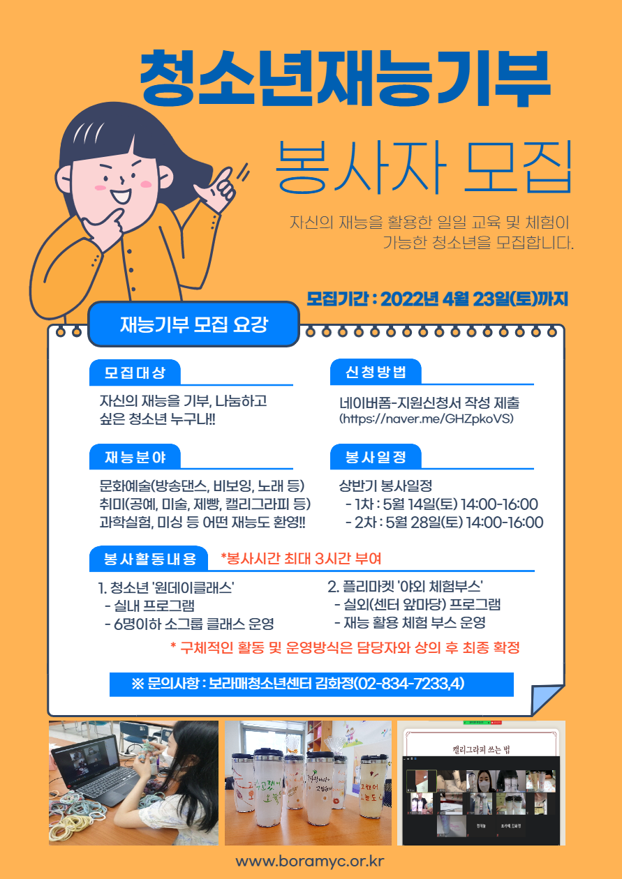 | ÀÛ¼ºÀÚ : û¼Ò³â»ç¾÷ÆÀ(program@boramyc.or.kr) ÀÛ¼ºÀÏ : 2022-04-12 Á¶È¸¼ö : 1865 | |||