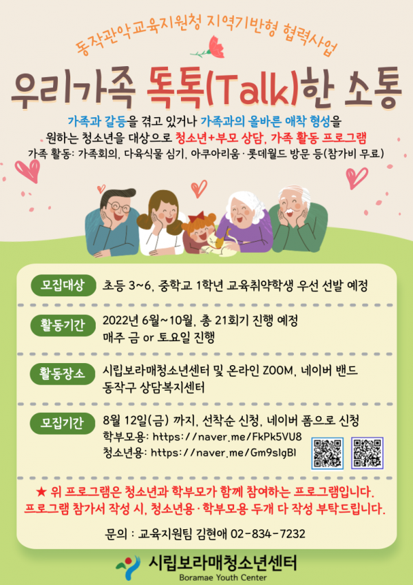 | [¸ðÁý] 2022³â Áö¿ª±â¹ÝÇü ±³À°º¹Áö Çù·Â»ç¾÷ '¿ì¸®°¡Á· ¶ÈÅå(Talk)ÇÑ ¼ÒÅë' Âü°¡ÀÚ ¸ðÁý | |||