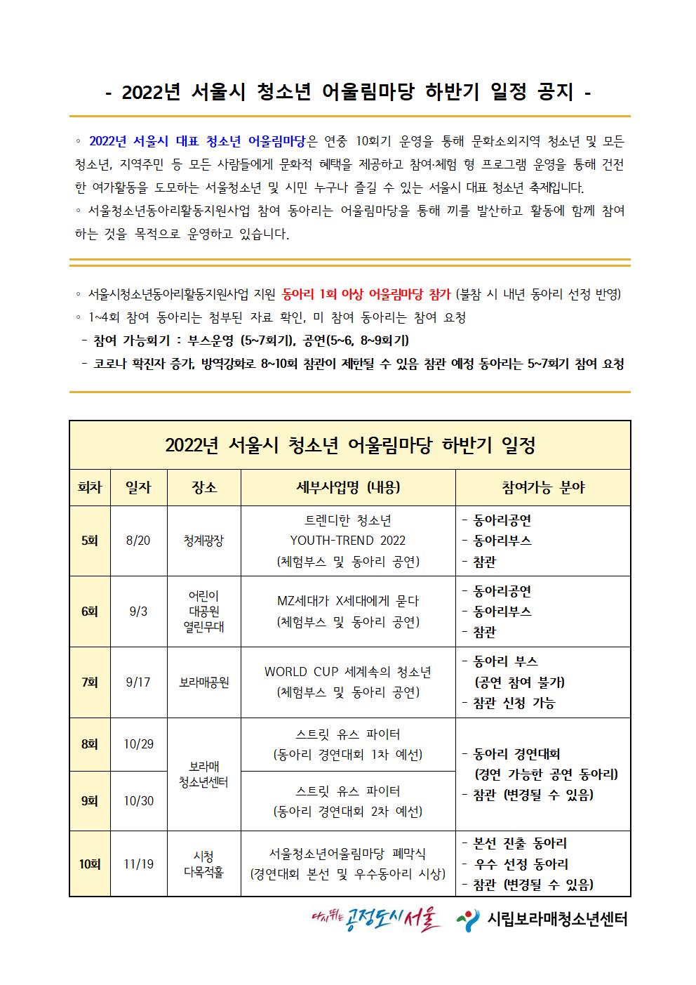 | [¾î¿ï¸²¸¶´ç] 2022 ¼¿ï½Ã û¼Ò³â ¾î¿ï¸²¸¶´ç ÇϹݱâ ÀÏÁ¤ ¹× Àå¼Ò °øÁö | |||
