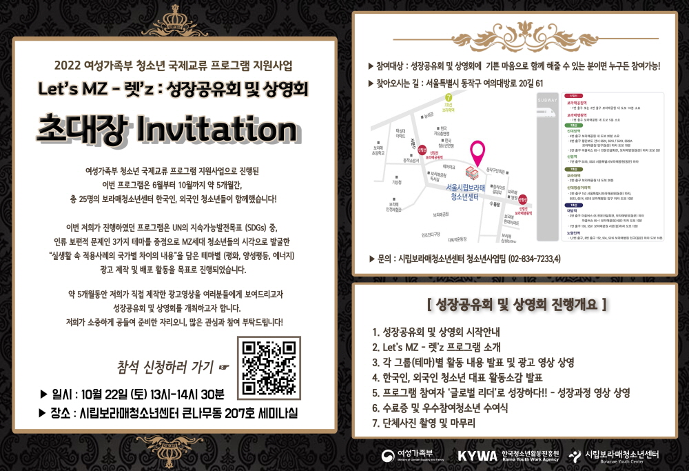 | [¾È³»] û¼Ò³â ±¹Á¦±³·ù ÇÁ·Î±×·¥ Áö¿ø»ç¾÷ : Let's MZ - ¼ºÀå°øÀ¯È¸ ¹× »ó¿µÈ¸ ¾È³» ¹× Âü¿©½Åû ¾È³» | |||