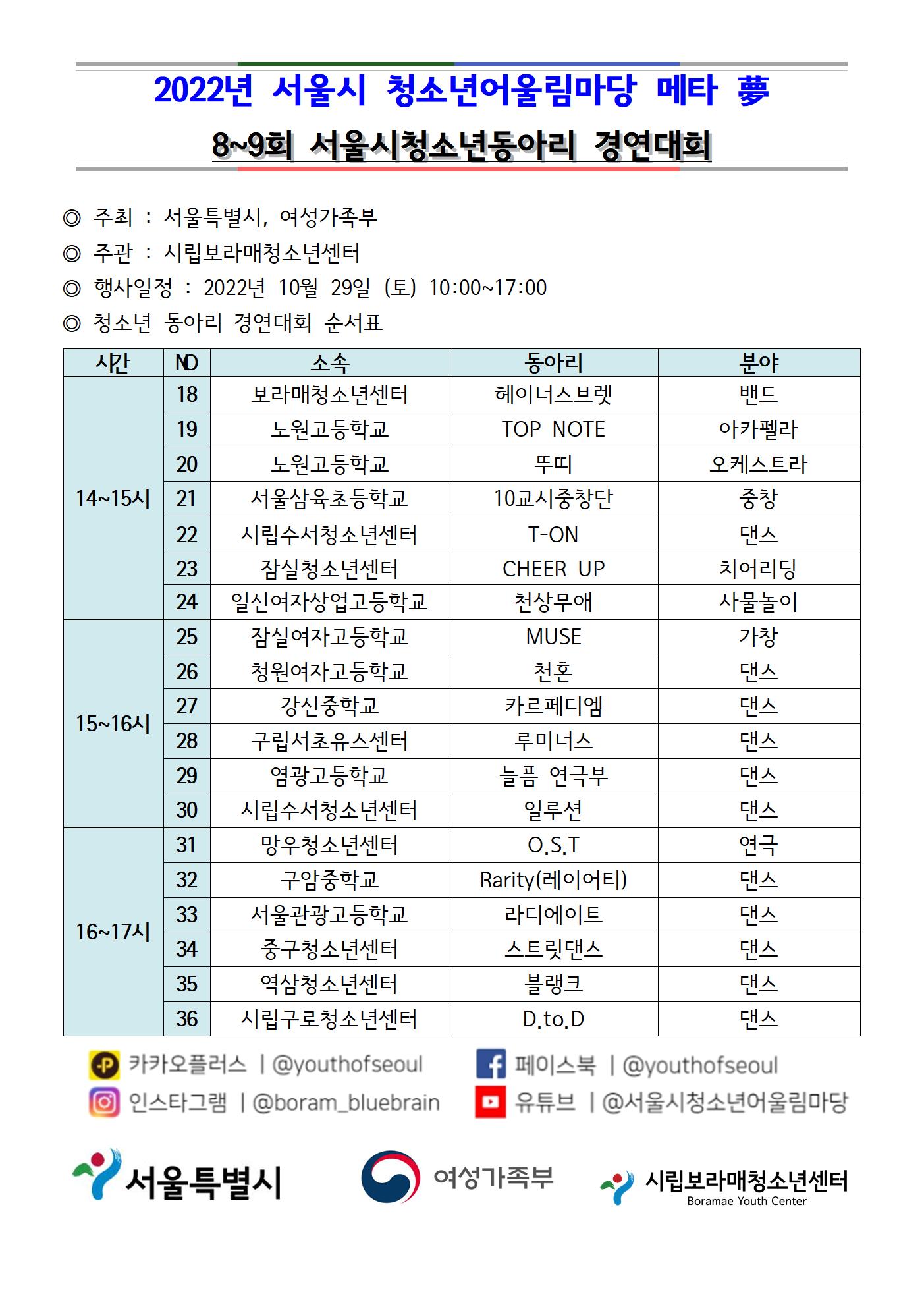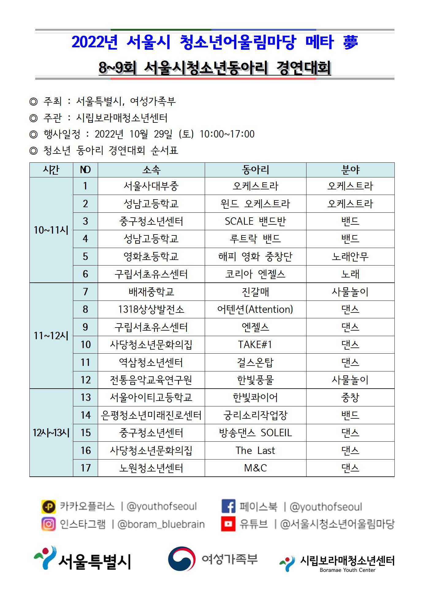 | [¾î¿ï¸²¸¶´ç] 2022³â ¼¿ï½Ã û¼Ò³â¾î¿ï¸²¸¶´ç 8~9ȸ û¼Ò³âµ¿¾Æ¸®°æ¿¬´ëȸ(°ø¿¬ È®Á¤ ¹× ¼ø¼¾È³») | |||