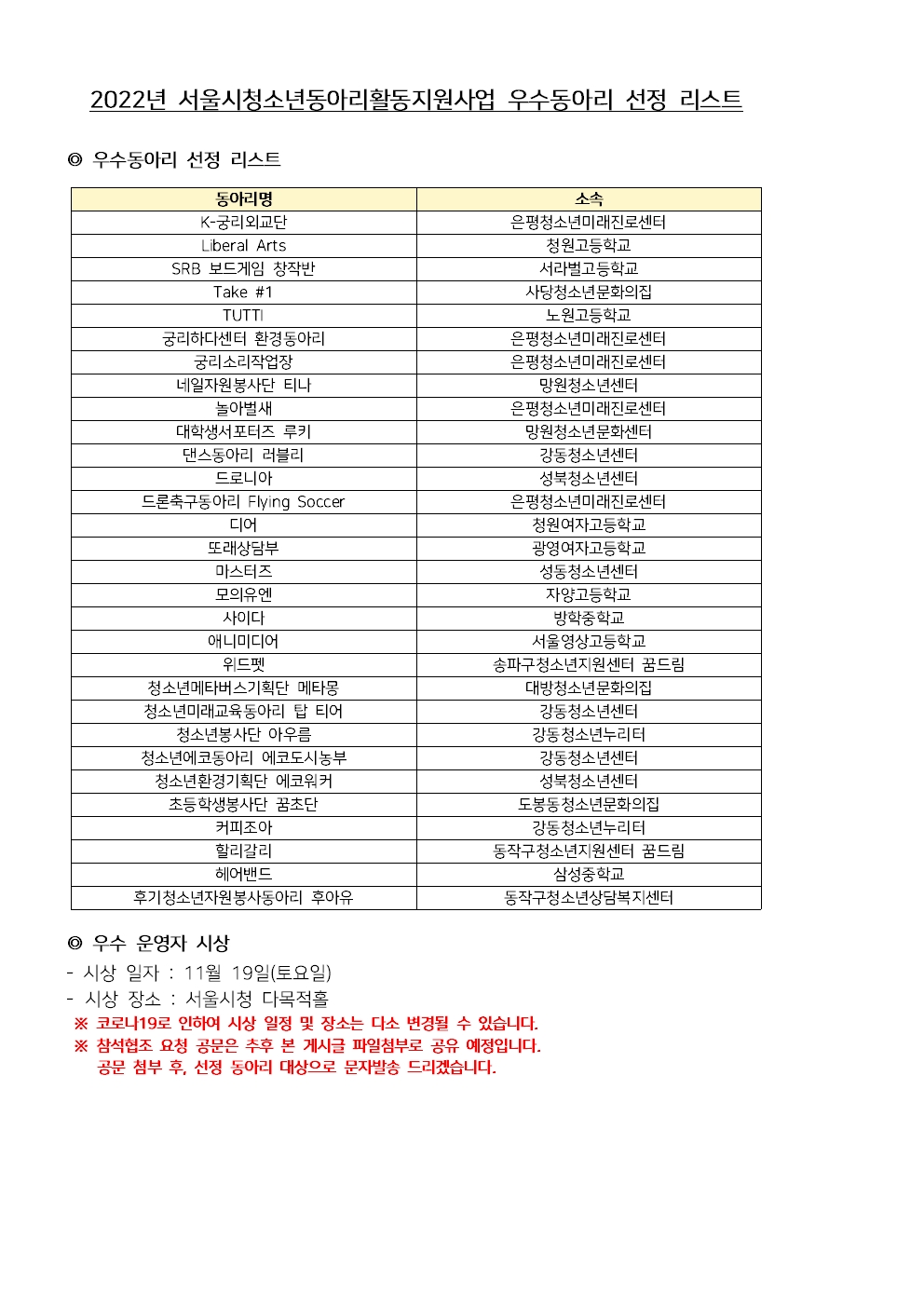 | [µ¿¾Æ¸®Áö¿ø»ç¾÷] 2022³â ¼¿ï½Ãû¼Ò³âµ¿¾Æ¸®È°µ¿Áö¿ø»ç¾÷ ¿ì¼öµ¿¾Æ¸® ¼±Á¤ °á°ú °øÁö | |||