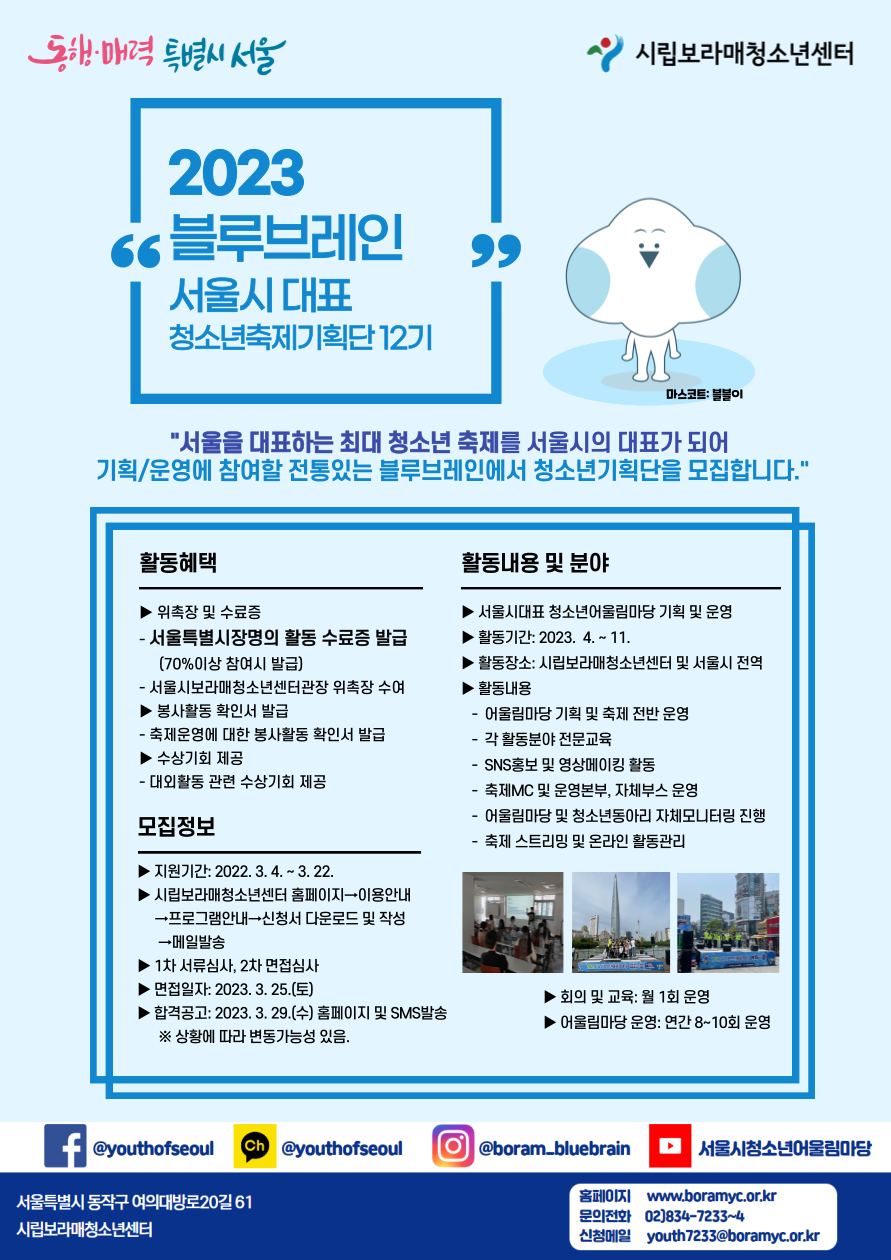 | [¸ðÁý] 2023³â ¼¿ï½Ã´ëÇ¥ û¼Ò³â¾î¿ï¸²¸¶´ç ±âȹ´Ü 'ºí·çºê·¹ÀÎ' 12±â ¸ðÁý | |||