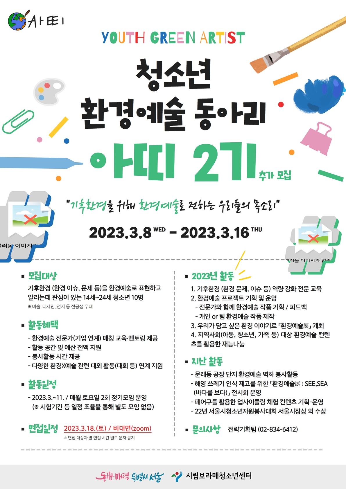 | [¸ðÁý] 2023³â û¼Ò³â ȯ°æ¿¹¼ú µ¿¾Æ¸® - ¾Æ¶ì 2±â Ãß°¡ ¸ðÁý (~3/16±îÁö) | ||||