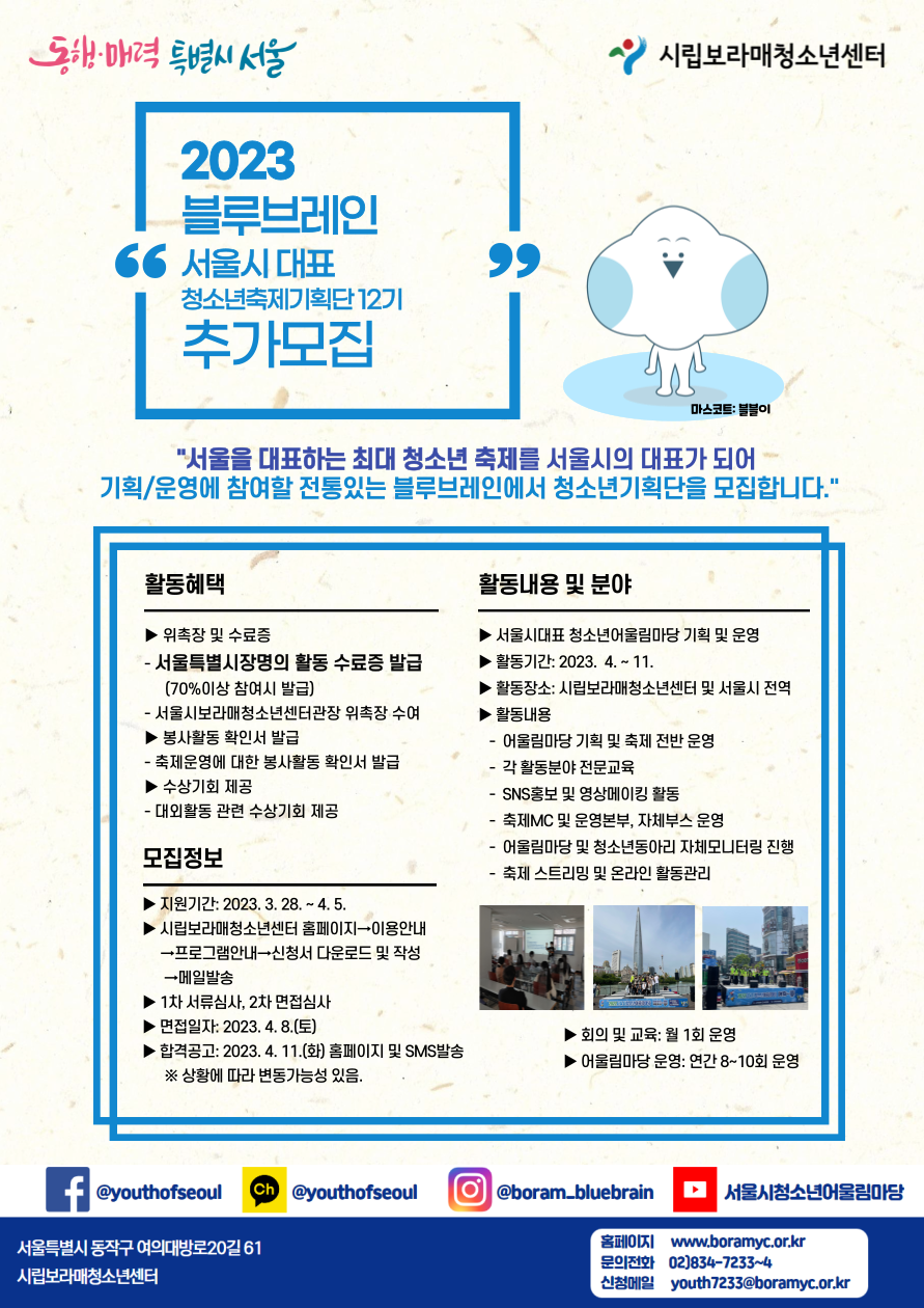 | [¾î¿ï¸²¸¶´ç] 2023³â ¼¿ï½Ã´ëÇ¥ û¼Ò³â¾î¿ï¸²¸¶´ç ±âȹ´Ü 'ºí·çºê·¹ÀÎ' 12±â Ãß°¡¸ðÁý (~4/5 ±îÁö) | |||