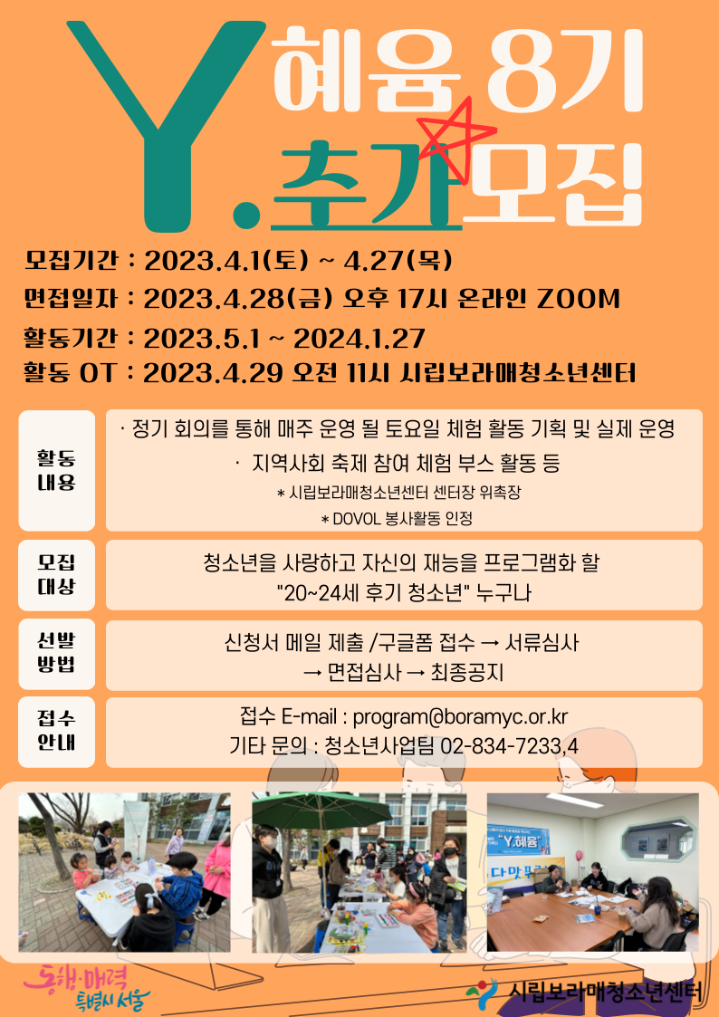 | ÀÛ¼ºÀÚ : û¼Ò³â»ç¾÷ÆÀ(program@boramyc.or.kr) ÀÛ¼ºÀÏ : 2023-04-05 Á¶È¸¼ö : 698 | |||