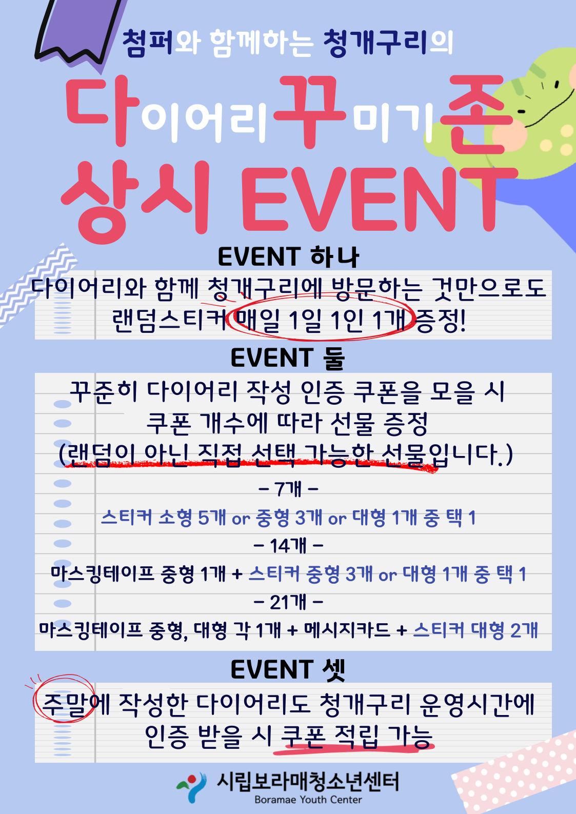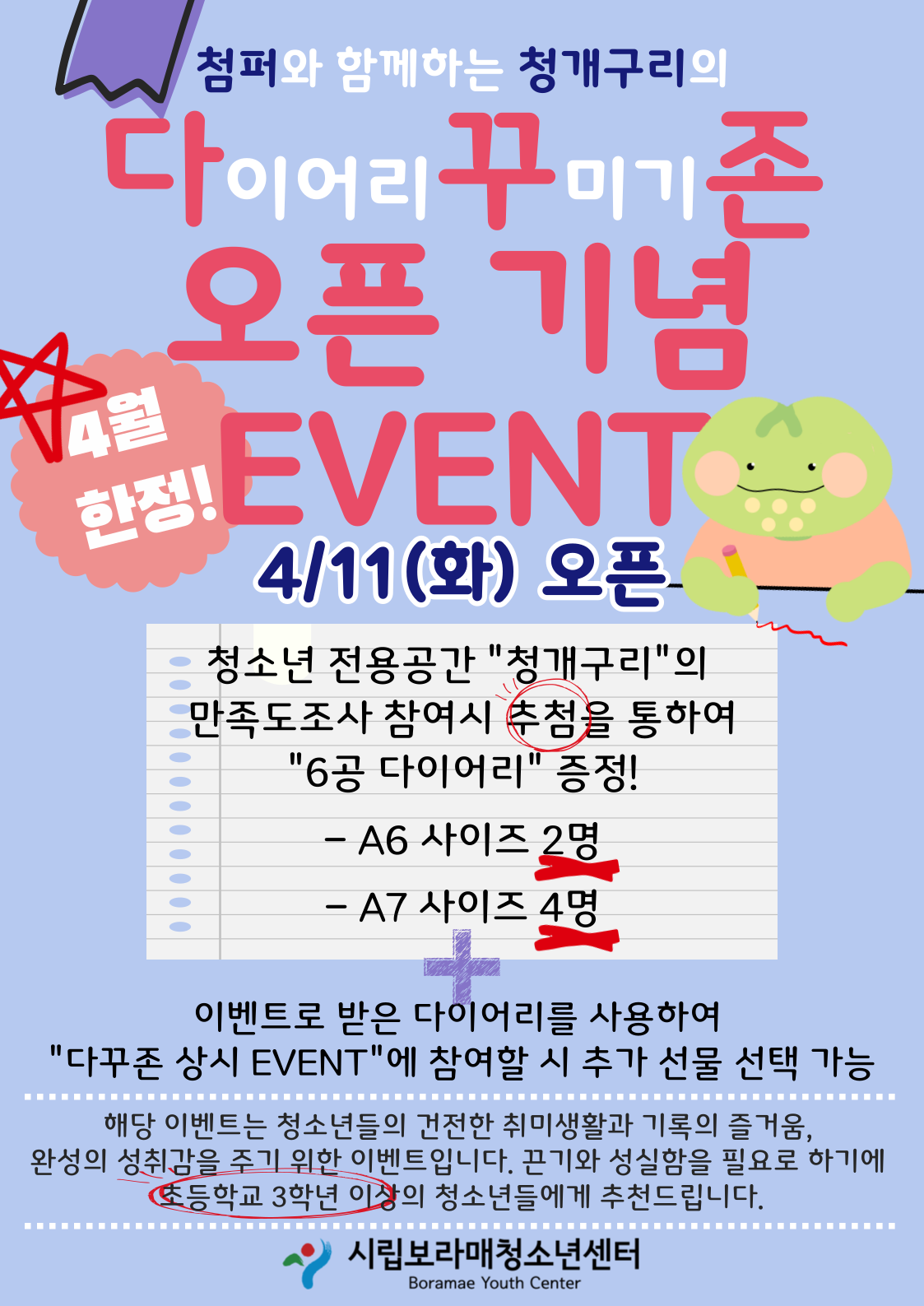 | [¾È³»] û¼Ò³â Àü¿ë°ø°£ û°³±¸¸® "´ÙÀ̾ ²Ù¹Ì±â Á¸(´Ù²ÙÁ¸)" OPEN ¾È³» | |||