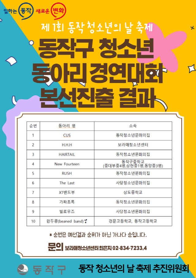 | [¾È³»] Á¦1ȸ µ¿ÀÛ Ã»¼Ò³âÀÇ ³¯ ÃàÁ¦ Çà»ç ¹× û¼Ò³âµ¿¾Æ¸® °æ¿¬´ëȸ º»¼±ÁøÃâ°á°ú ¾È³» | ||||