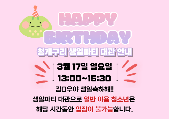 | [¾È³»] 2024³â 3¿ù 17ÀÏ Ã»°³±¸¸® »ýÀÏÆÄÆ¼ ´ë°ü ¾È³» | |||
