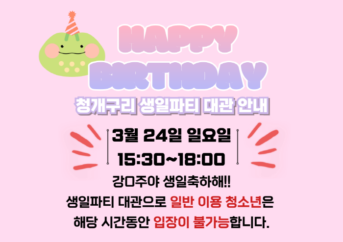 | [¾È³»] 2024³â 3¿ù 24ÀÏ Ã»°³±¸¸® »ýÀÏÆÄÆ¼ ´ë°ü ¾È³» | |||