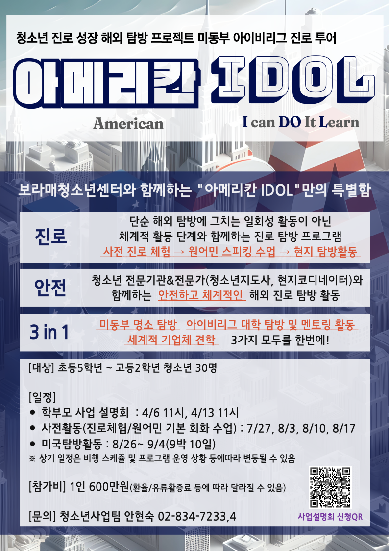 | [¸ðÁý] û¼Ò³â Áø·Î¼ºÀå ÇØ¿Ü ޹æ ÇÁ·ÎÁ§Æ® [¾Æ¸Þ¸®Ä IDOL] Çкθð »ç¾÷¼³¸íȸ Âü°¡ ½Åû | |||