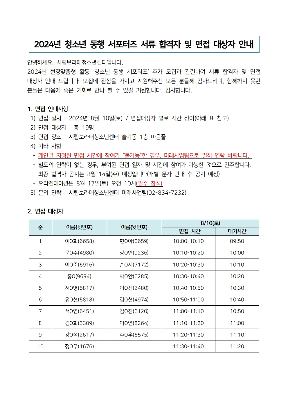 | [¾È³»] 2024³â ÇöÀå¸ÂÃãÇü û¼Ò³âµ¿Çà¼Æ÷ÅÍÁî ¼·ù ÇÕ°ÝÀÚ ¹× ¸éÁ¢ ´ë»óÀÚ ¾È³»(2Â÷) | |||