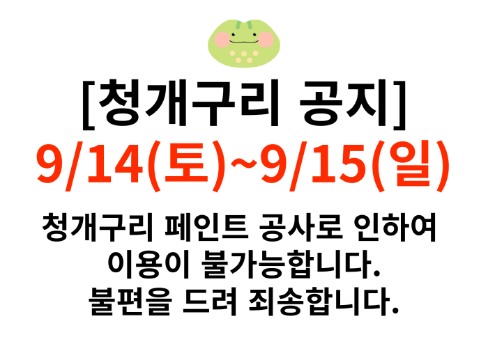 | [¾È³»] 9/14(Åä)~9/15(ÀÏ) û°³±¸¸® ÆäÀÎÆ® °ø»ç ¾È³» | |||