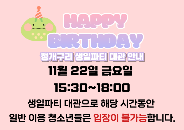 | [¾È³»] 2024³â 11¿ù 22ÀÏ Ã»°³±¸¸® »ýÀÏÆÄÆ¼ ´ë°ü ¾È³» | |||