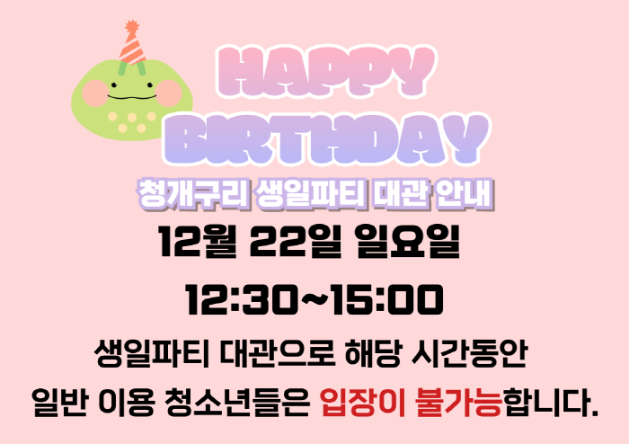 | [¾È³»] 2024³â 12¿ù 22ÀÏ Ã»°³±¸¸® »ýÀÏÆÄÆ¼ ´ë°ü ¾È³» | |||