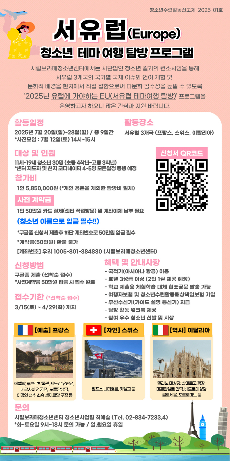 [¸ðÁý] 2025³â û¼Ò³â Å׸¶ ¿©Çà ÇØ¿Ü޹æ(¼À¯·´) - À¯·´¿¡ °¡¾ßÇÏ´Â EU Âü°¡ÀÚ ¸ðÁý | |||