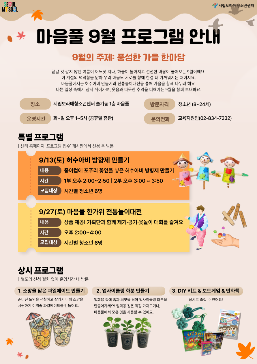 [¾È³»] û¼Ò³âÀü¿ë°ø°£ '¸¶À½Ç®' 9¿ù ÇÁ·Î±×·¥ ¾È³» | |||