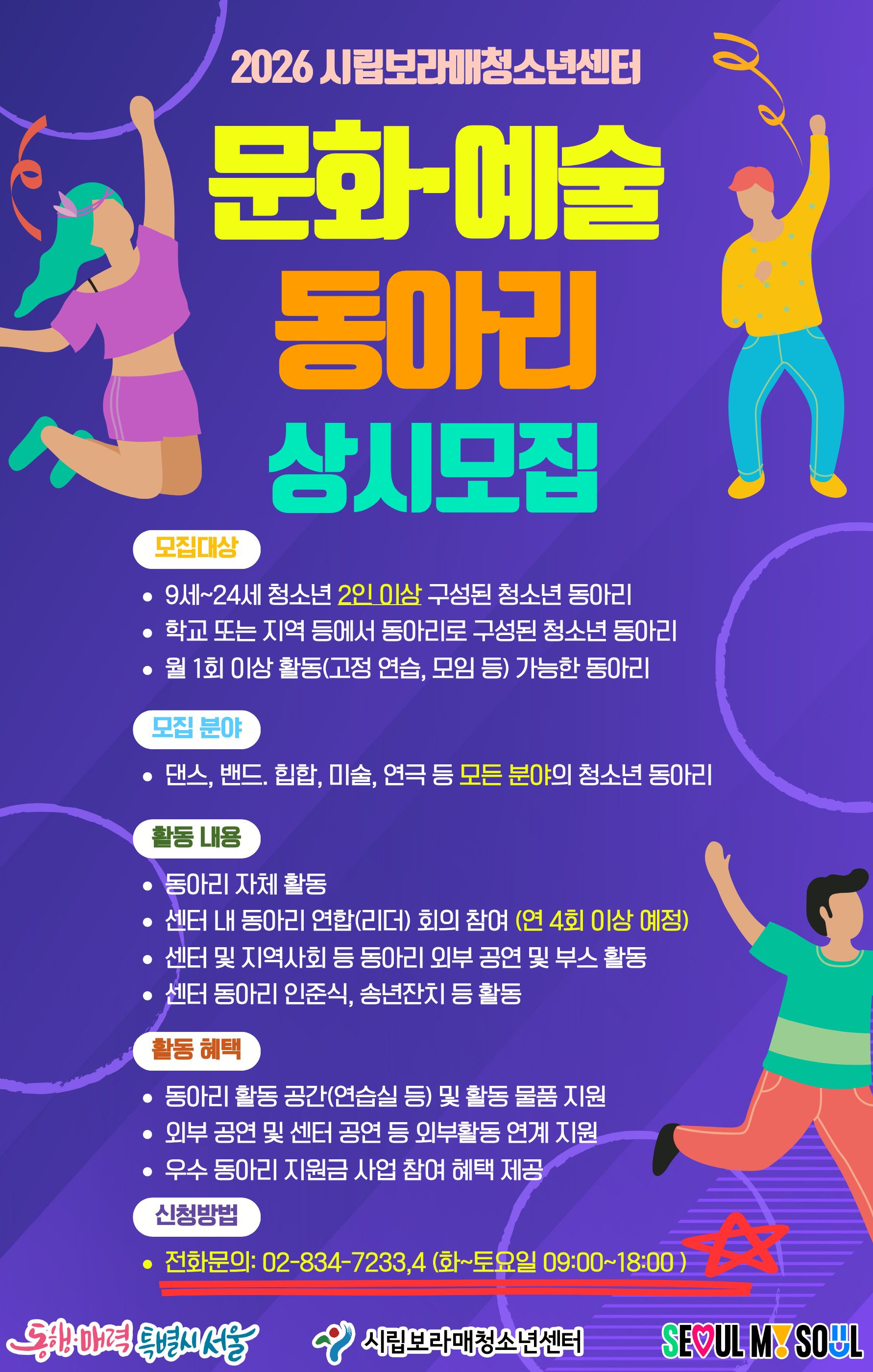 | [¸ðÁý] 2026 ½Ã¸³º¸¶ó¸Åû¼Ò³â¼¾ÅÍ ¹®È¡¤¿¹¼ú µ¿¾Æ¸® ¿¬Áß »ó½Ã ¸ðÁý! | |||