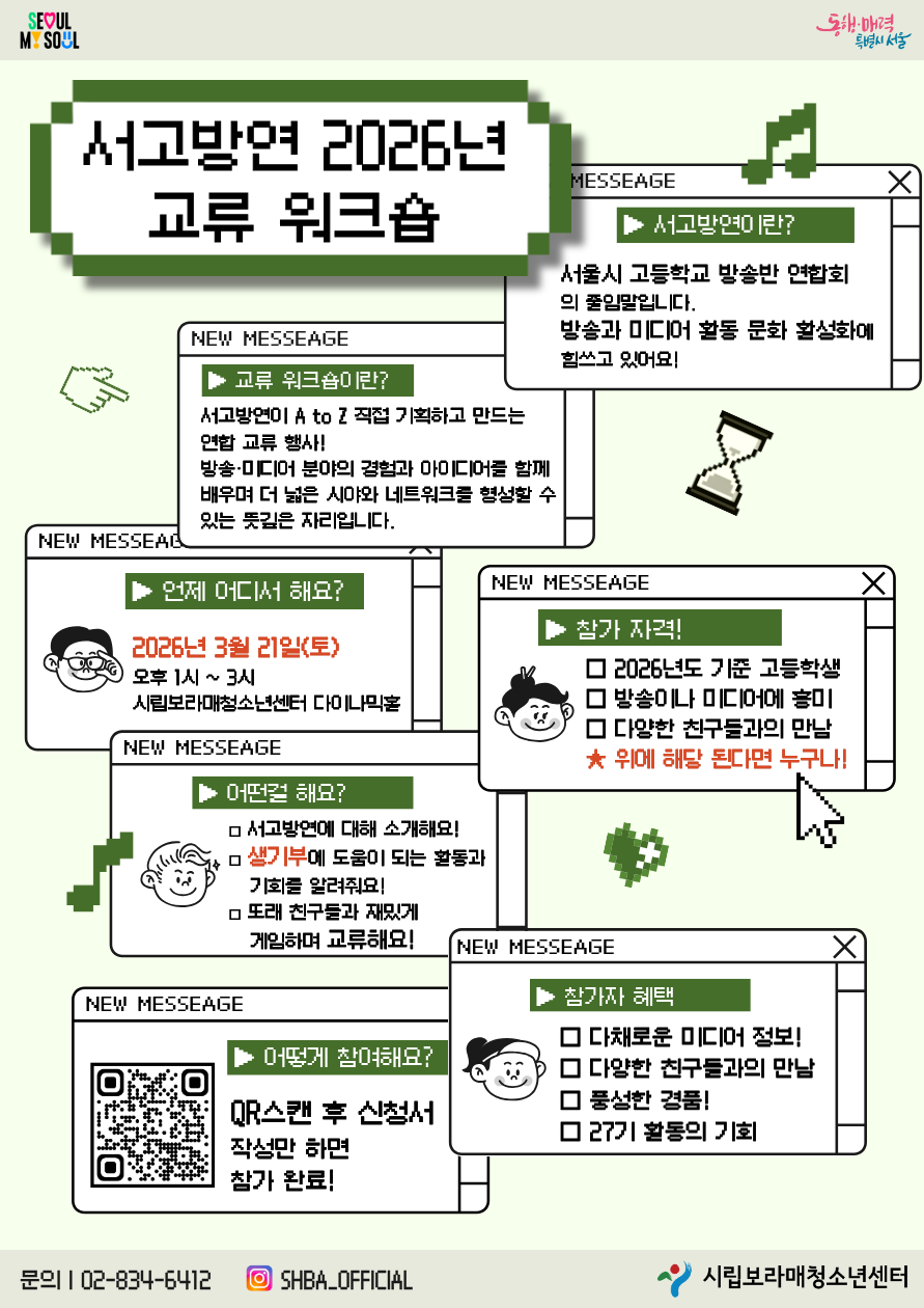 | [¸ðÁý] 2026³â ¼°í¹æ¿¬(¼¿ï½Ã °íµîÇб³ ¹æ¼Û¹Ý ¿¬ÇÕ) 1Â÷ ¿öÅ©¼ó Âü¿© û¼Ò³â ¸ðÁý! | |||