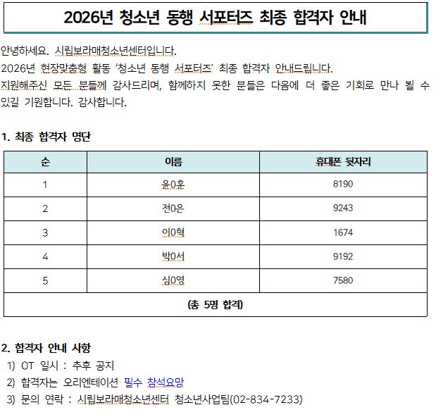 | [¾È³»] 2026³â ÇöÀå¸ÂÃãÇüȰµ¿ µ¿Çà¼Æ÷ÅÍÁî ÃÖÁ¾ ÇÕ°ÝÀÚ ¾È³» | |||