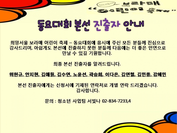 | Èñ¸Á¼¿ï º¸¶ó¸Å ¾î¸°ÀÌÃàÁ¦ - µ¿¿ä´ëȸ º»¼± ÁøÃâÀÚ ¹ßÇ¥ | |||