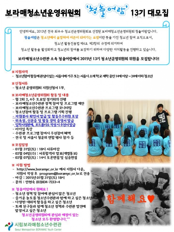 | [¸ðÁý]º¸¶ó¸Åû¼Ò³â¿î¿µÀ§¿øÈ¸ 13±â ½ÅÀÔÀ§¿ø ¸ðÁý | |||