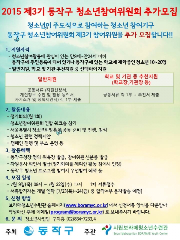 | ÆÄÀÏ÷ºÎ : 2015 µ¿ÀÛ±¸ û¼Ò³âÂü¿©À§¿øÈ¸ Ãß°¡¸ðÁý.jpg û¼Ò³â Âü¿©À§¿øÈ¸ ½Åû¼·ù(0).hwp | |||
