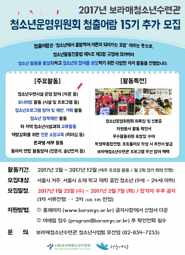 | [¸ðÁý] 2017³â º¸¶ó¸Åû¼Ò³â¿î¿µÀ§¿øÈ¸ ûÃâ¾î¶÷ 15±â Ãß°¡¸ðÁý | |||