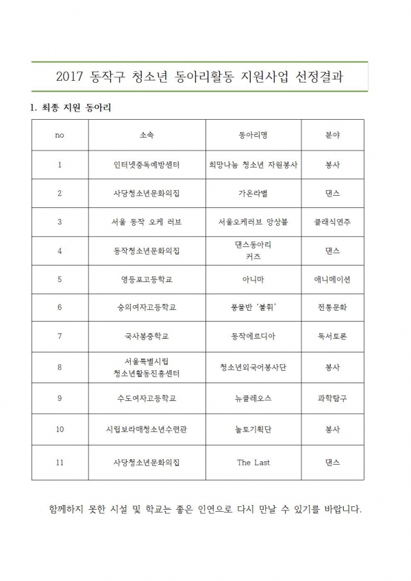 | 2017 µ¿ÀÛ±¸ û¼Ò³â µ¿¾Æ¸®È°µ¿ Áö¿ø»ç¾÷ ¼±Á¤°á°ú | |||