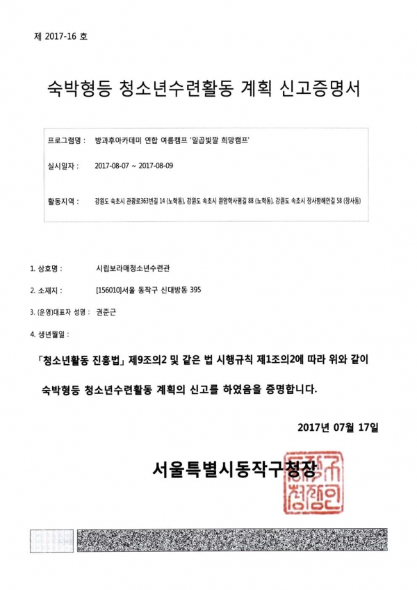 | ÀÛ¼ºÀÚ : º¸¶ó¸Åû¼Ò³â¼ö·Ã°ü() ÀÛ¼ºÀÏ : 2017-07-18 Á¶È¸¼ö : 2898 | |||