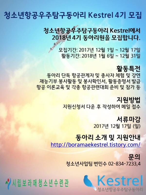 | [¸ðÁý]û¼Ò³âÇ×°ø¿ìÁÖŽ±¸µ¿¾Æ¸® Kestrel 4±â Ãß°¡ ¸ðÁý | |||
