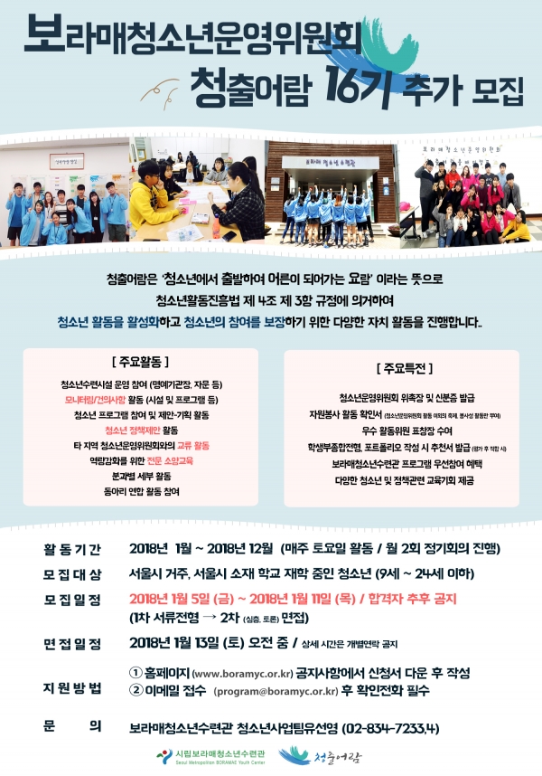 | [Ãß°¡¸ðÁý] º¸¶ó¸Åû¼Ò³â¿î¿µÀ§¿øÈ¸ ûÃâ¾î¶÷ 16±â ¸ðÁý | |||