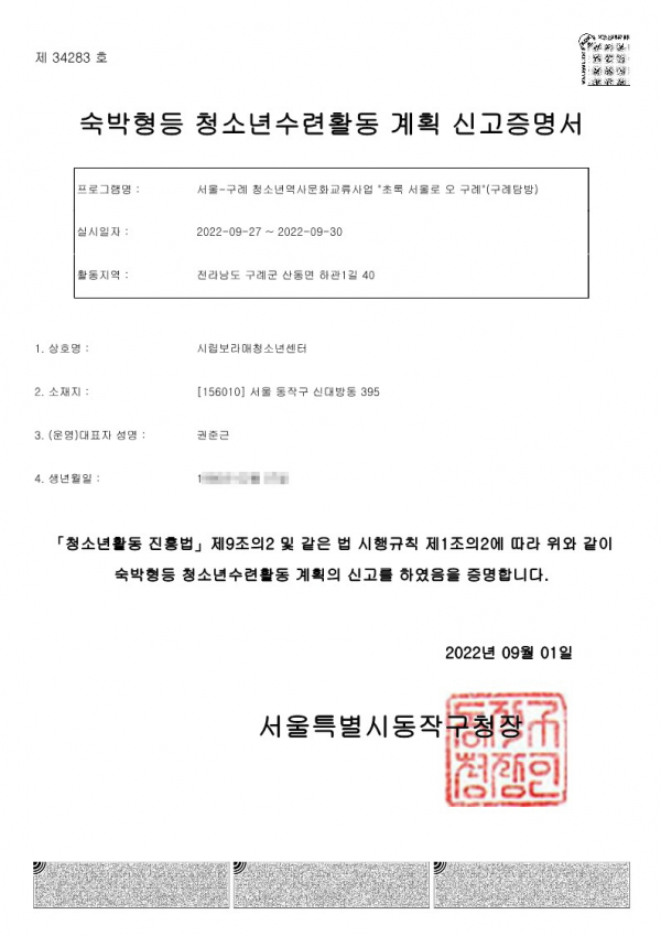 | [°øÁö] 2022 ¼¿ï-±¸·Ê û¼Ò³â¿ª»ç¹®È±³·ùȰµ¿ »çÀü½Å°íÁõ¸í¼(±¸·Ê) | |||