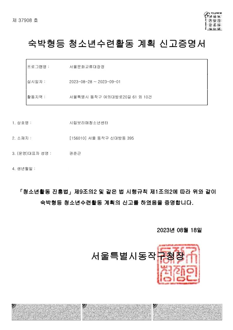 | [°øÁö] 2023³â ¼¿ï¹®È±³·ù´ëÀåÁ¤ - û¼Ò³â¼ö·ÃȰµ¿½Å°íÁ¦ ½Ç½Ã ¿Ï·á ¾È³» | ||||