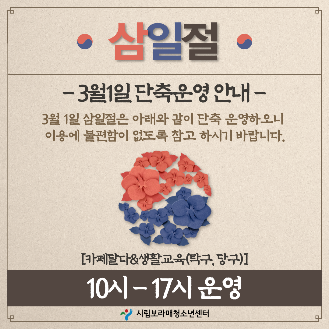 | ÀÛ¼ºÀÚ : ½Ã¸³º¸¶ó¸Åû¼Ò³â¼¾ÅÍ(webmaster@boramyc.or.kr) ÀÛ¼ºÀÏ : 2024-02-23 Á¶È¸¼ö : 7426 | |||
