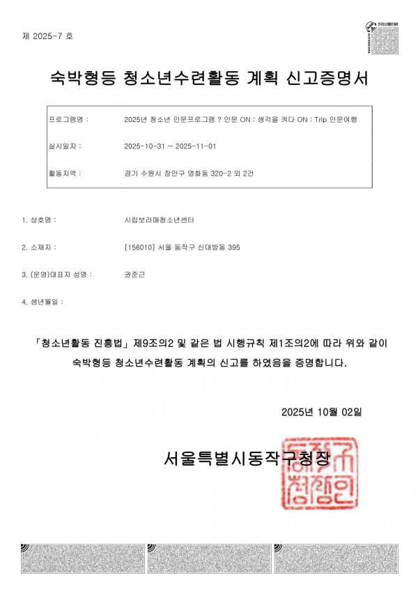 [°øÁö] 2025 û¼Ò³âÀι®ÇÁ·Î±×·¥ 'Àι®ON:»ý°¢À» ÄÑ´Ù' ON:Trip(Àι®¿©Çà) û¼Ò³â ¼ö·ÃȰµ¿ ½Å°íÁ¦ ½Ç½Ã ¿Ï·á ¾È³» | |||