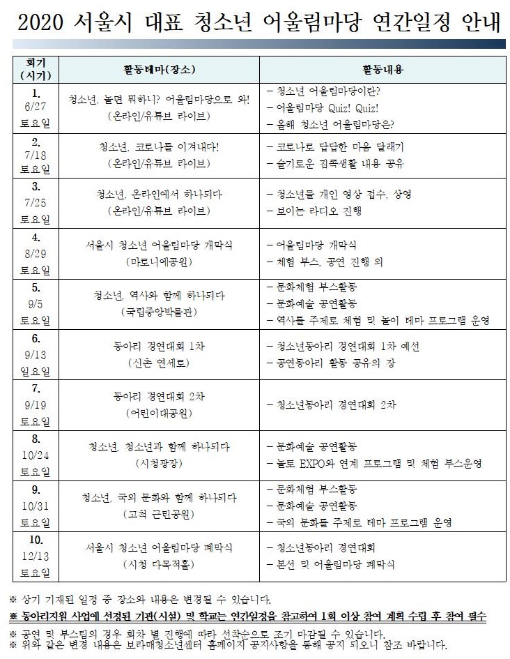 | [¾î¿ï¸²¸¶´ç] [¾È³»]2020 ¼¿ï½Ã û¼Ò³â ¾î¿ï¸²¸¶´ç ¿¬Áß ÀÏÁ¤ ¾È³» | |||