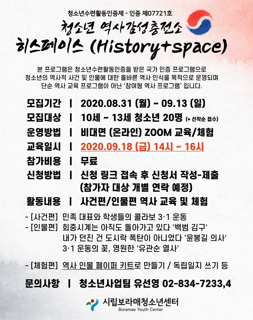 | [¸ðÁý] [¸¶°¨][¿Â¶óÀÎ ±³À°-üÇè][ÀÎÁõ] û¼Ò³â ¿ª»ç°¨¼ºÃæÀü¼Ò È÷½ºÆäÀ̽º Âü°¡ÀÚ ¸ðÁý | |||