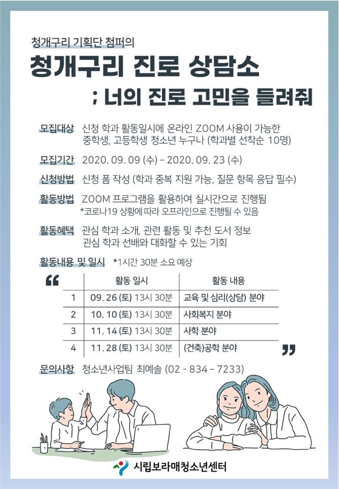 | [¸ðÁý] [¿Â¶óÀÎ ÇÁ·Î±×·¥] û°³±¸¸® Áø·Î »ó´ã¼Ò : ³ÊÀÇ Áø·Î °í¹ÎÀ» µé·ÁÁà Âü°¡ û¼Ò³â ¸ðÁý ¾È³» | |||
