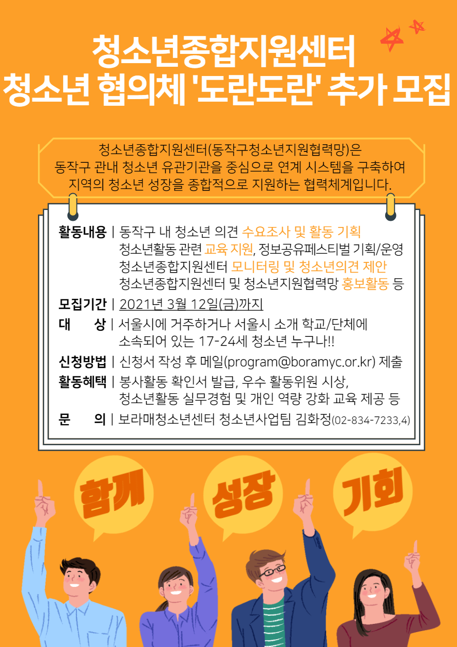 | ÀÛ¼ºÀÚ : û¼Ò³â»ç¾÷ÆÀ(program@boramyc.or.kr) ÀÛ¼ºÀÏ : 2021-03-02 Á¶È¸¼ö : 3020 | |||