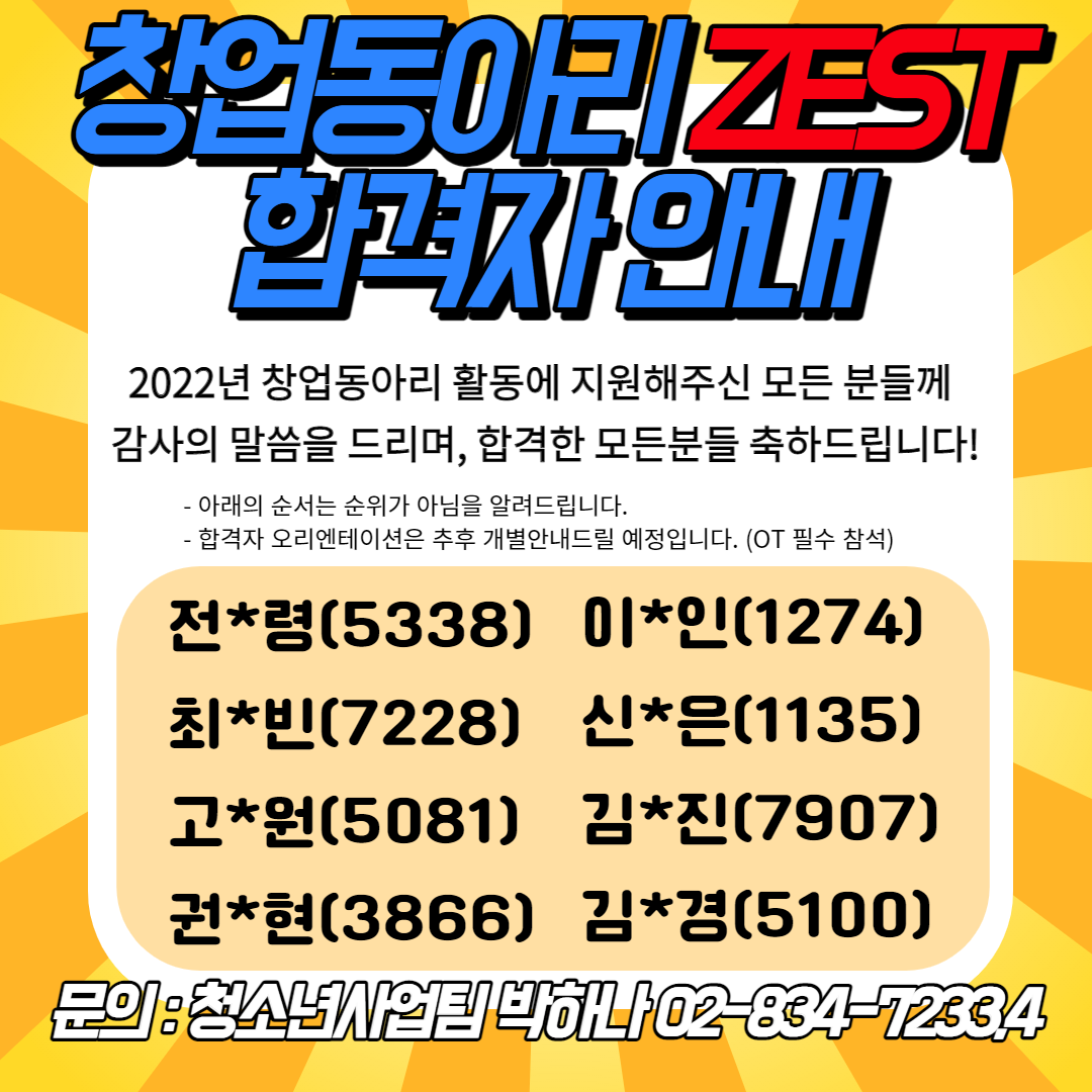 | [¾È³»] 2022 û¼Ò³â â¾÷¸¶´ç : â¾÷µ¿¾Æ¸®¿ø ÃÖÁ¾ ÇÕ°ÝÀÚ ¾È³» | |||