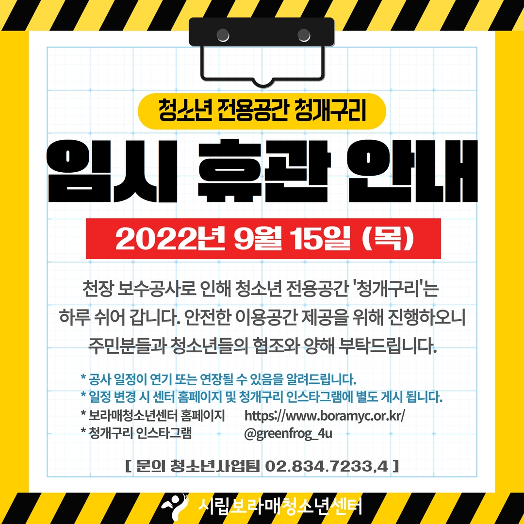 | [¾È³»] û¼Ò³â Àü¿ë°ø°£ 'û°³±¸¸®' Àӽà ÈÞ°ü ¾È³» (9¿ù 15ÀÏ) | |||
