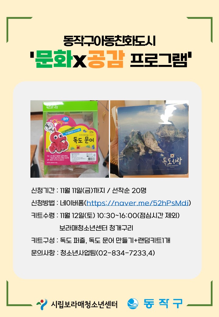 | [¸ðÁý] µ¿ÀÛ±¸¾Æµ¿Ä£Èµµ½Ã '¹®Èx°ø°¨ ÇÁ·Î±×·¥' Âü¿©ÀÚ ¸ðÁý | |||