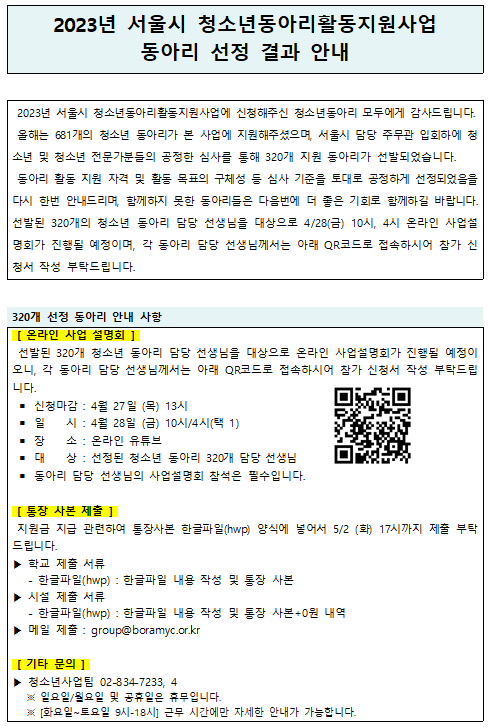 | [µ¿¾Æ¸®Áö¿ø»ç¾÷] 2023³â ¼¿ï½Ã û¼Ò³âµ¿¾Æ¸®È°µ¿Áö¿ø»ç¾÷ ¼±Á¤ µ¿¾Æ¸® °ø°í ¹× ±âŸ ¾È³» | |||